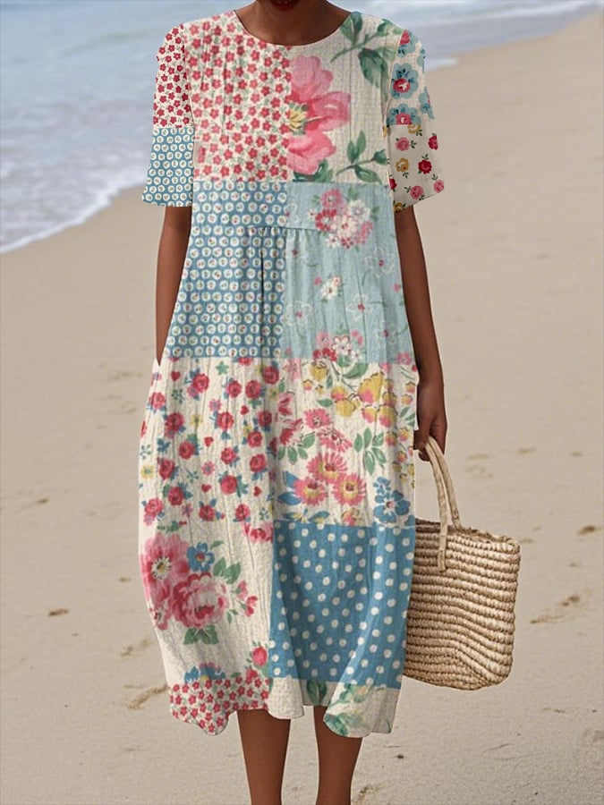 Women's Casual Round Neck Mid Sleeve Print Cotton and Linen Dress