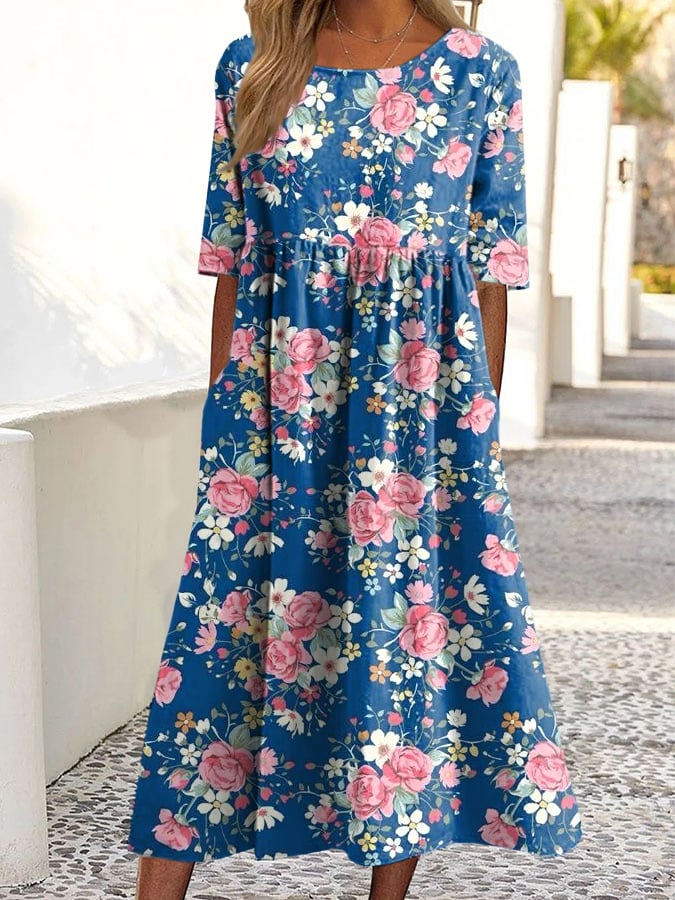 Women's Vintage Floral Print Casual Round Neck Short Sleeves Dress