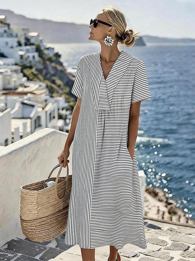 Women's Casual V-Neck Striped Loose Dress