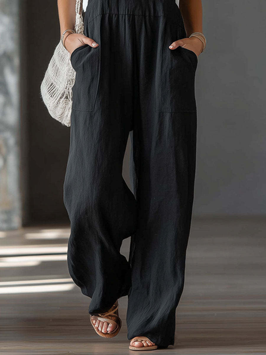 Perfect for casual outings, creative workdays, or weekend getaways, these overalls pair beautifully with fitted tops, cropped tees, or lightweight blouses underneath. Dress them up with heeled sandals and layered jewelry, or keep it easy with sneakers and a woven bag. Balancing function, comfort, and understated romance, these black cotton-linen overalls deliver timeless boho refinement with a modern twist.