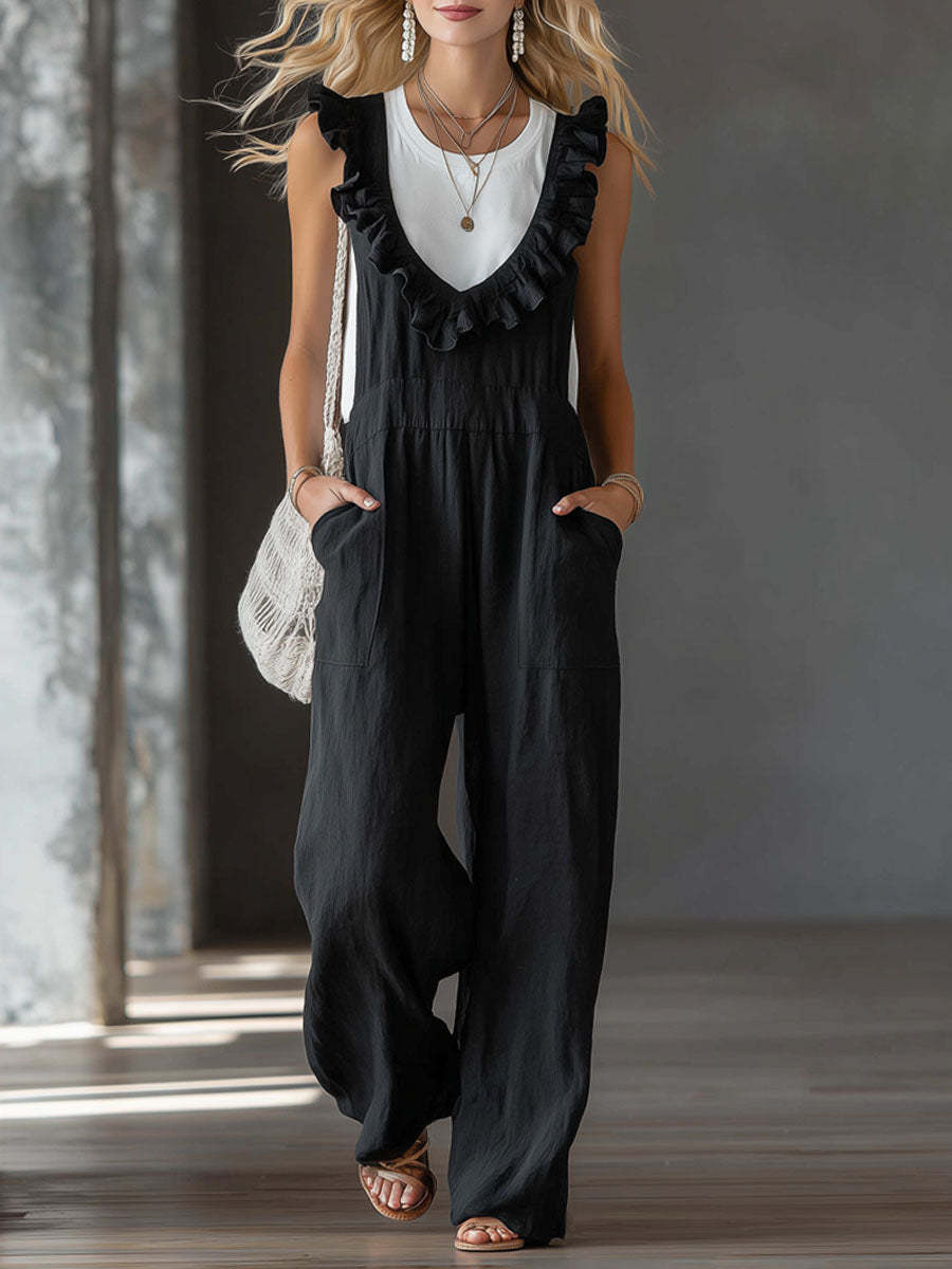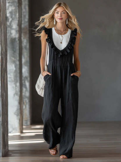 Bring effortless elegance to your everyday style with our Black V-Neck Ruffled Cotton-Linen Wide-Leg Overalls. Made from a breathable cotton-linen blend, these overalls combine natural texture with a relaxed yet refined silhouette. The V-neckline offers a flattering touch, while delicate ruffle detailing along the straps or bodice adds a hint of feminine charm. The wide-leg design ensures comfort and flow, giving the piece a graceful drape and laid-back sophistication that works for any season.