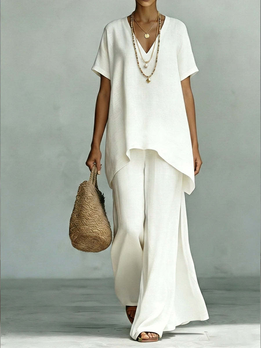 Classic Casual Short-sleeved Linen And Cotton Top And Wide-leg Pants Two-piece Set