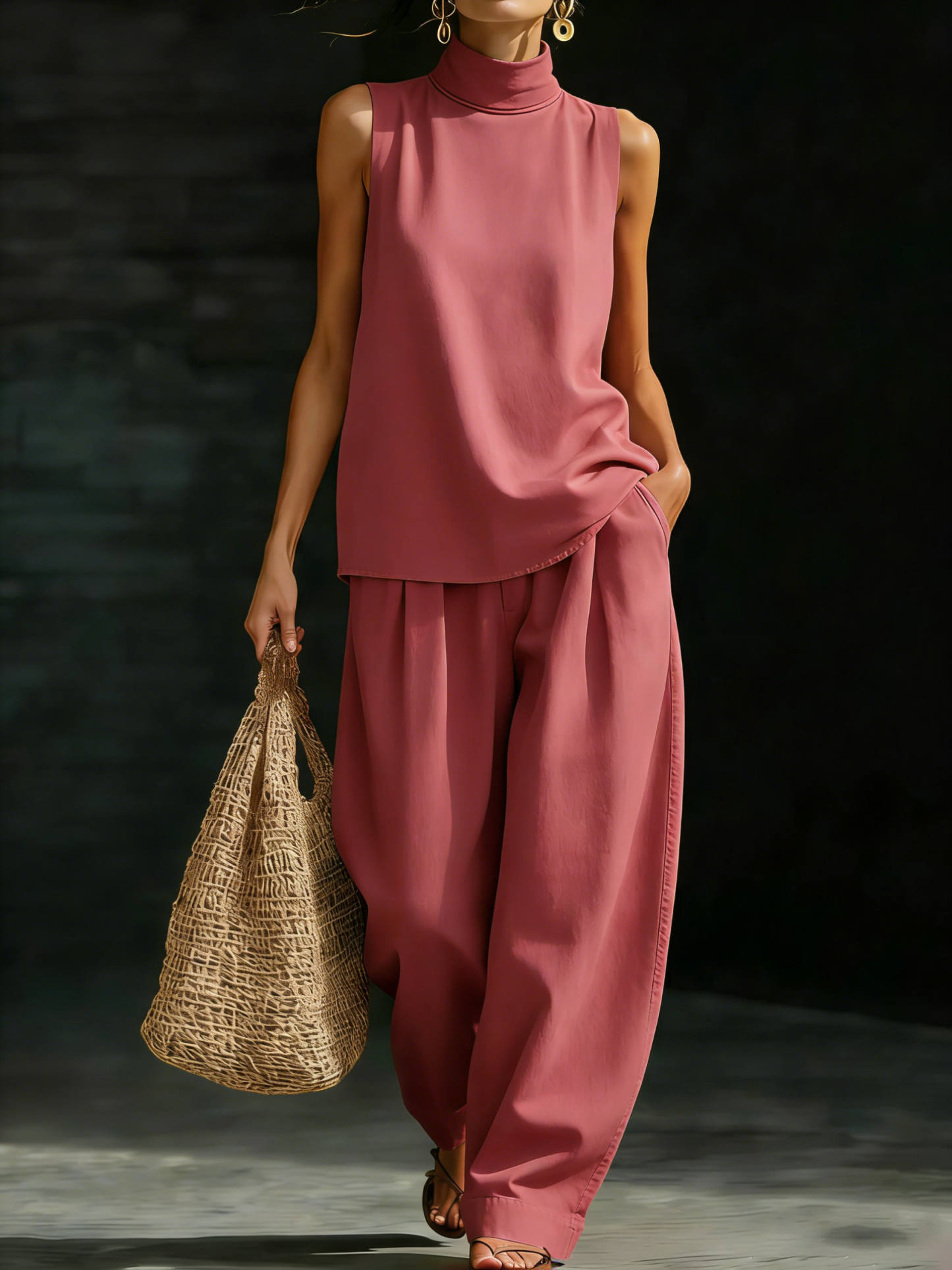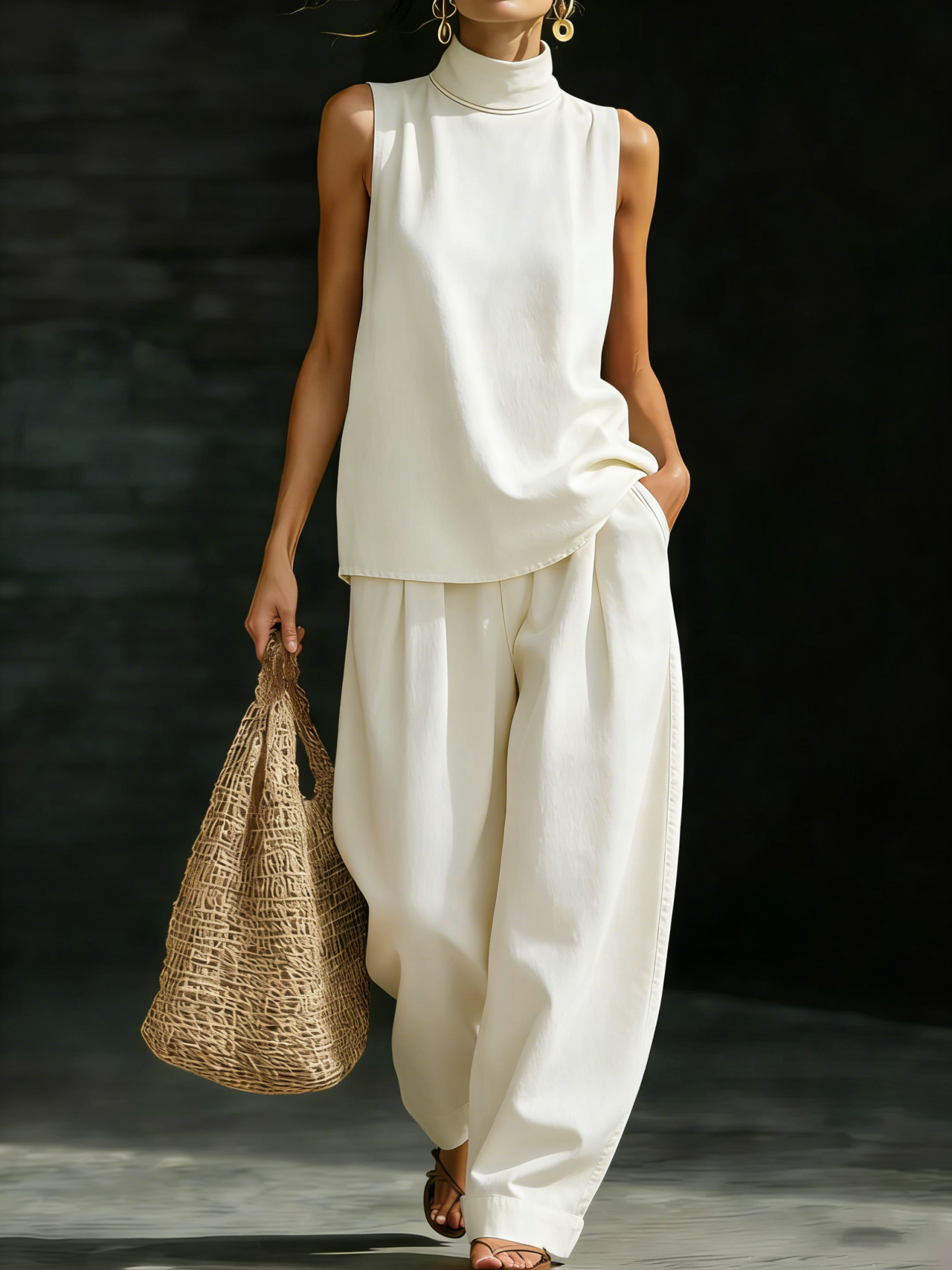 Casual And Cozy Minimalist Sleeveless Tank Top Wide Pants Linen Two-piece Set