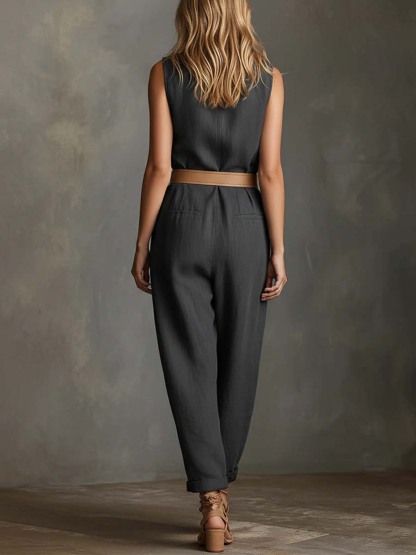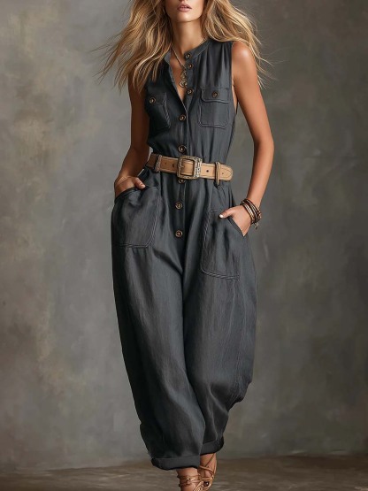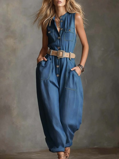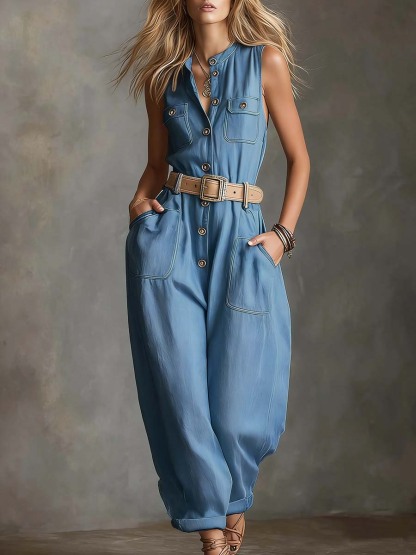 Women's Round Neck Sleeveless Casual Loose Denim Jumpsuit